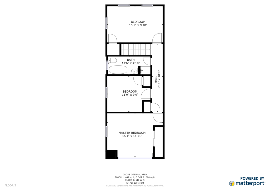 Move upstairs to the three bedrooms and one bathroom on the second floor.