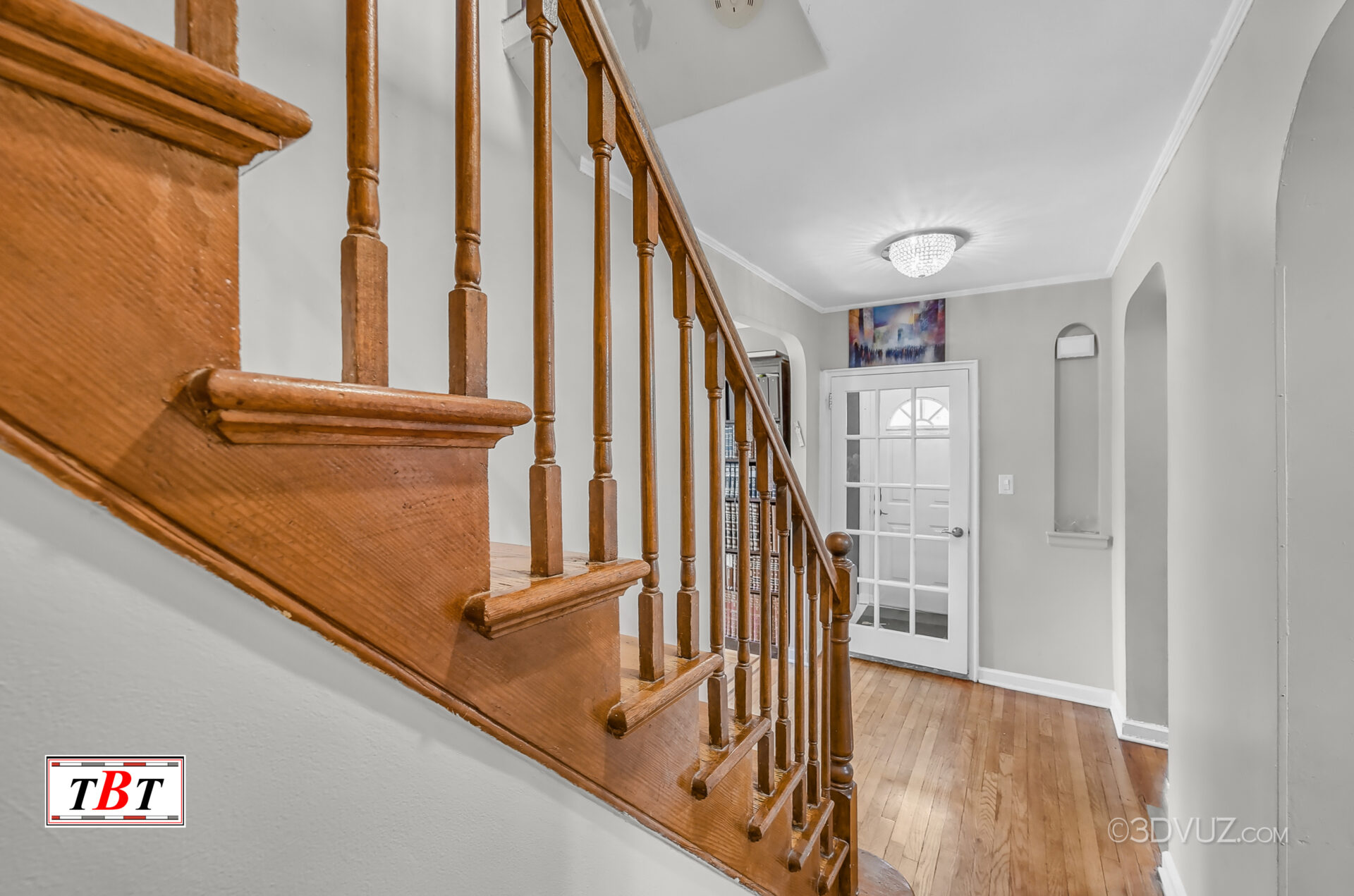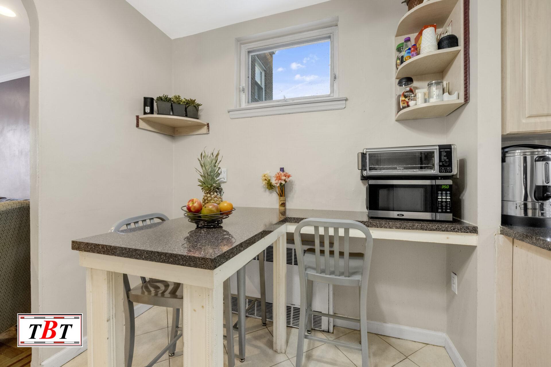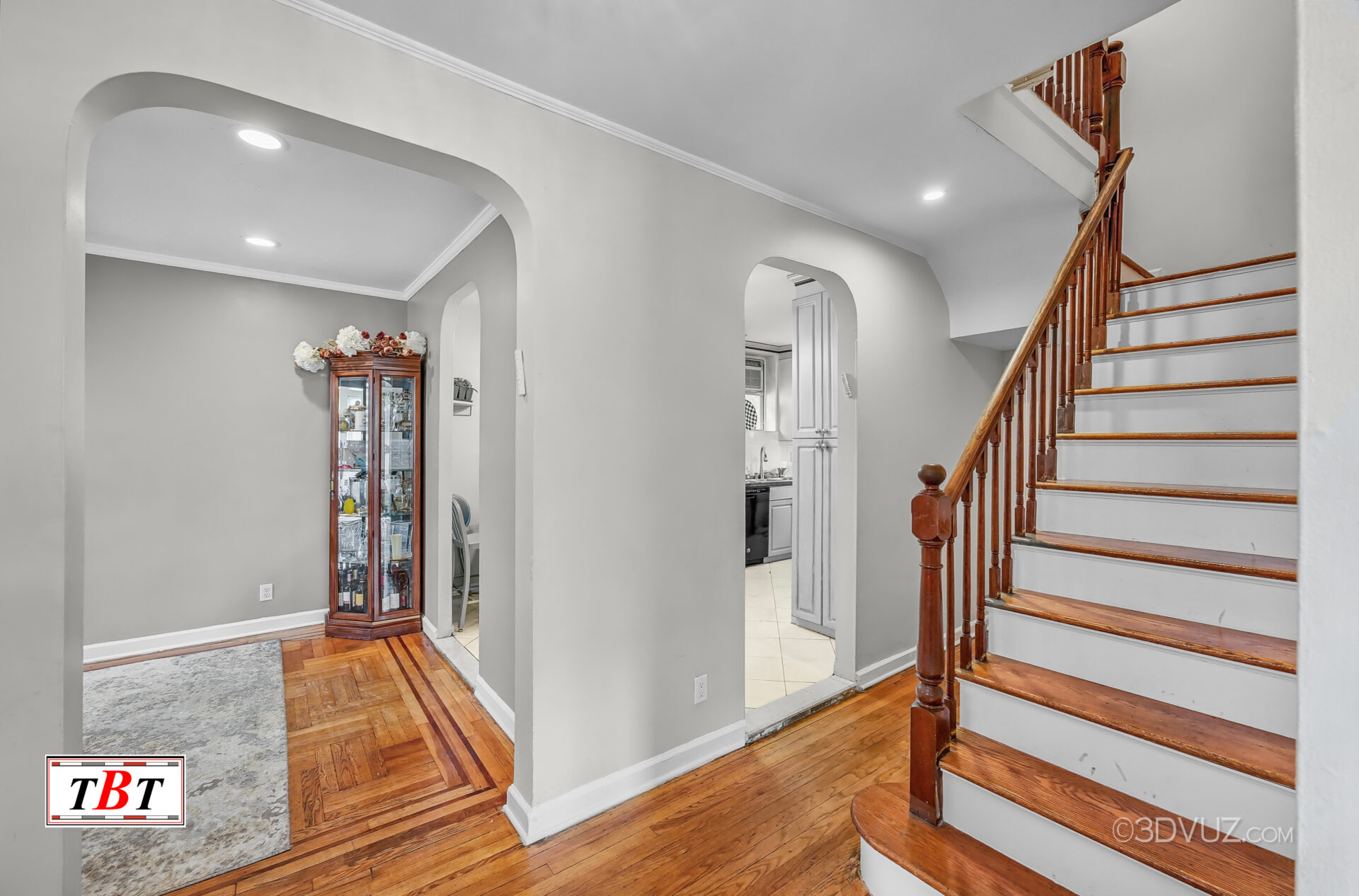 Upon entering you’ll be greeted by an inviting foyer with a deep coat closet followed by a sun-drenched formal living room & dining room outfitted with elegant wooden flooring which flows until an eat-in-kitchen loaded with cabinetry. A half bathroom adds convenience to this level.